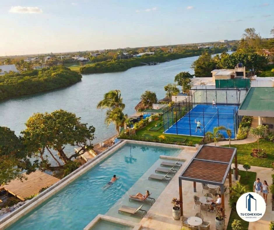 🏊 Alberca y asoleadero · 🎾 Cancha de pádel · 🍹 Palapa bar · ⛵ Muelle privado · 🛶 Club de kayaks · 💪 Gimnasio equipado · 🧘 Área de meditación · 📚 Zona de lectura · 👶 Juegos infantiles · 🐕 Pet park · 🌴 Zona de hamacas frente al río · 🍖 Asadores pergolados · 🌅 Mirador al río · ⛳ Golfito · 🏌️ Carritos de golf · 🛋️ Salón de usos múltiples · 🏠 Lobby y concierge · 🔒 Caseta de vigilancia 24/7 · 🛗 Elevador · 🌳 Área de descanso